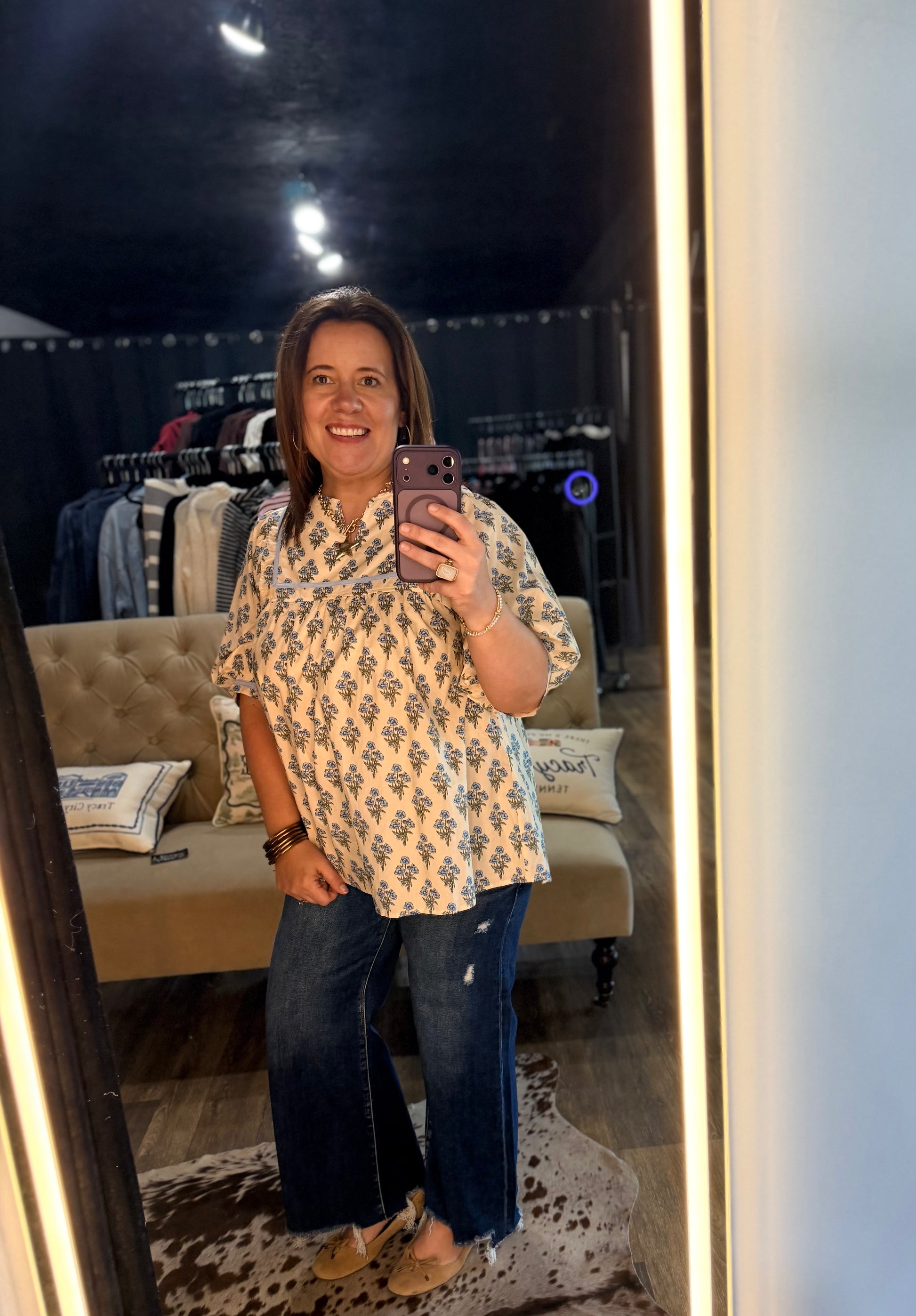 Fresh, feminine, and full of charm, the Spring Garden Top brings effortless style to your everyday wardrobe. Featuring a soft sky blue delicate floral print, this blouse is accented with subtle blue trim along the neckline and sleeves for the perfect pop of color. The relaxed, flowy fit and lightly gathered front create a flattering silhouette that's both comfortable and stylish. Whether paired with white denim for a polished look or dressed down with your favorite jeans, this top is an easy choice for spring days, brunch dates, and everything in between. Soft lightweight fabric keeps you comfortable all day long. The relaxed, flowy silhouette drapes beautifully while the lightly gathered front adds gentle definition. Short puff sleeves and blue accent trim complete the charming design.