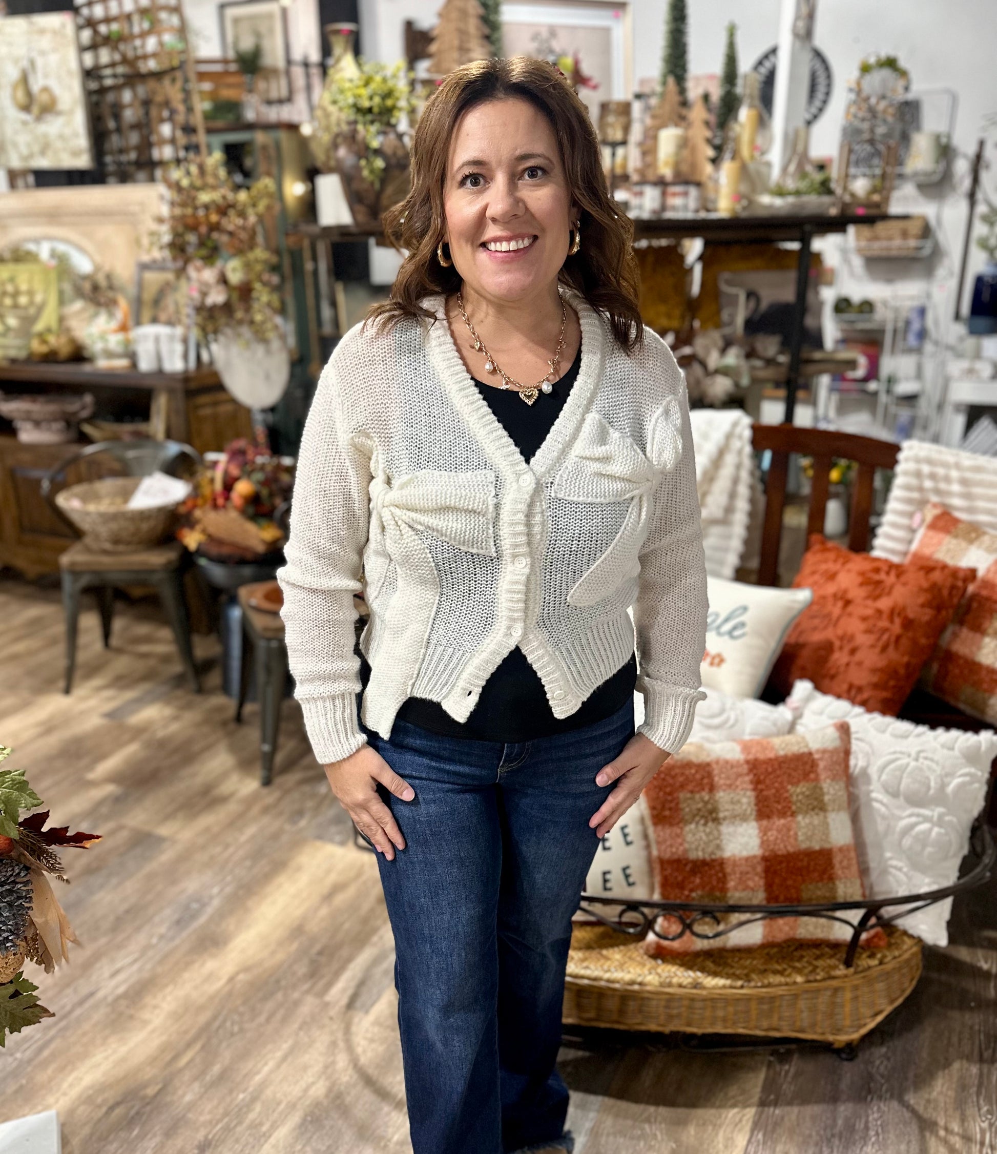 This cropped cardigan brings a soft, playful touch to your wardrobe with its cozy fabric and charming bow-accented pockets. Perfect for layering, it adds a flirty, fun twist to any outfit while keeping you comfortably warm.