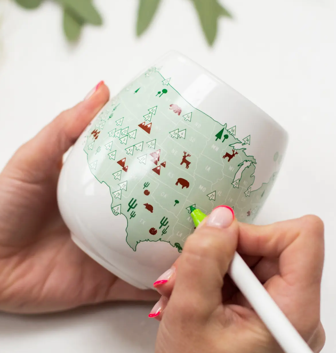 Celebrate your love for adventure with this playful National Parks USA Mug! Featuring a detailed map with 63 hand-numbered trees representing each park, you can color in every place you’ve explored using the included green ceramic brushpen. Crafted with expert Polish ceramics, this 500 ml mug is microwave and dishwasher safe, making it perfect for everyday use. Packaged plastic-free, it’s a sustainable gift that invites you to track your journey one colorful tree at a time. Just color, dry, bake, and watch your memories come to life!