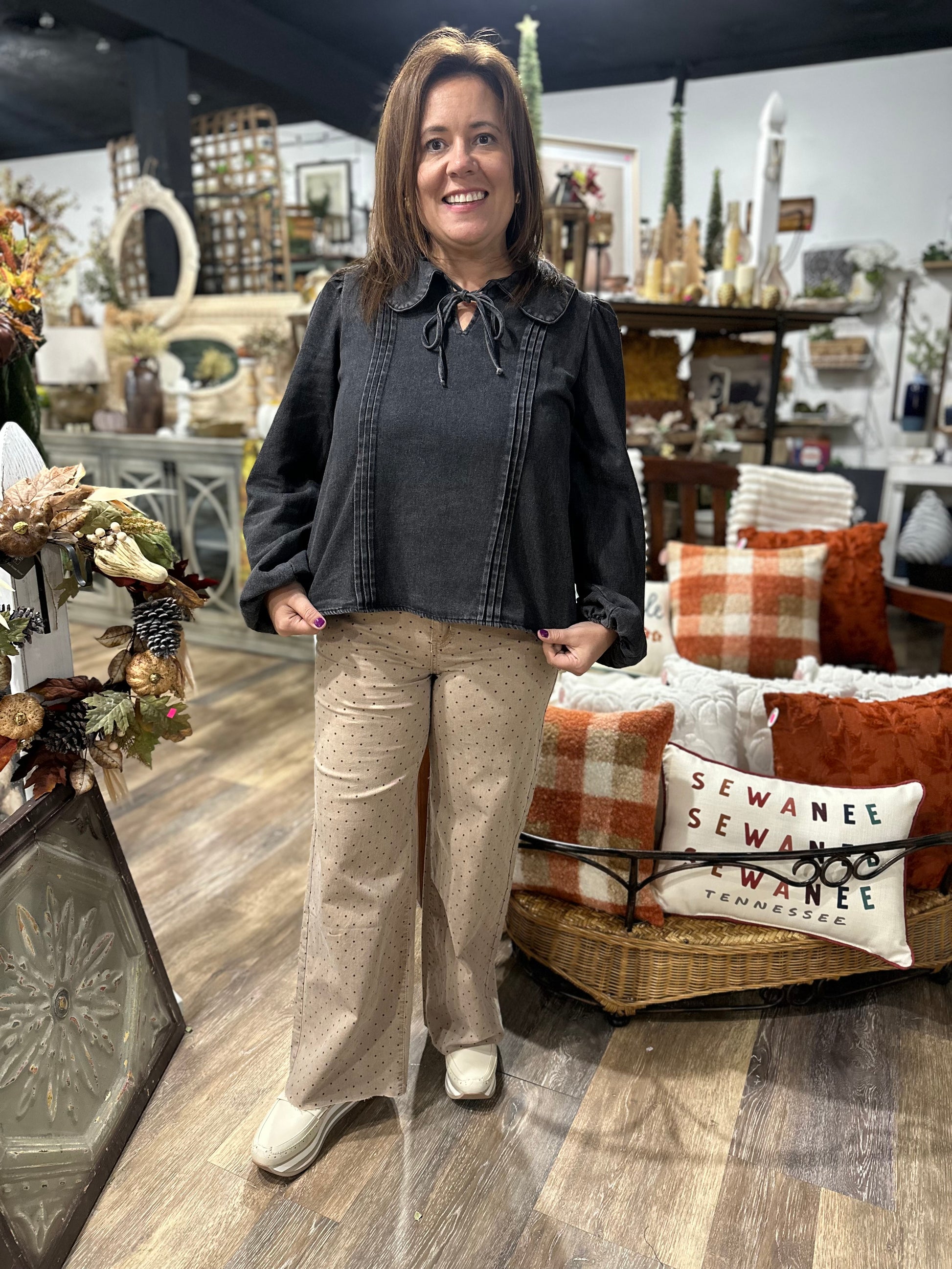 Add a fun twist to your wardrobe with these Polkadot Printed Twill Pants. Featuring a playful black polka dot pattern, button and zip closure, and handy front and back pockets, they combine style with practicality. The straight leg silhouette and cropped length with raw hem detailing give a trendy, carefree vibe perfect for any casual outing.