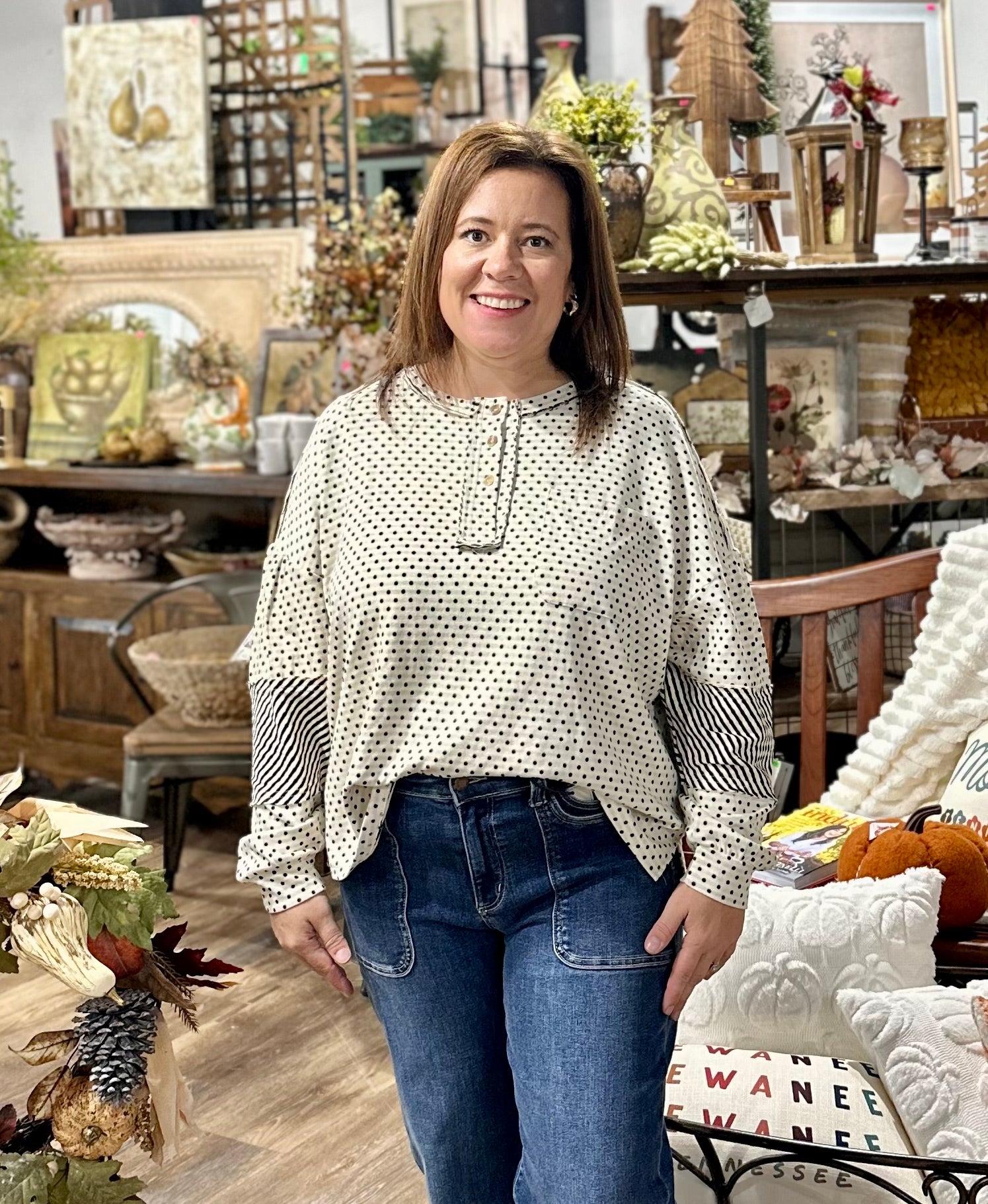 Get ready to turn heads with the Premium Polkadot Dot! This playful henley-style top features a handy pocket and eye-catching patchwork sleeves with bold stripes. The cuffed sleeves and classic crewneck add a comfy, casual vibe perfect for everyday fun. Add a splash of whimsy to your wardrobe with this unique, stylish piece!
