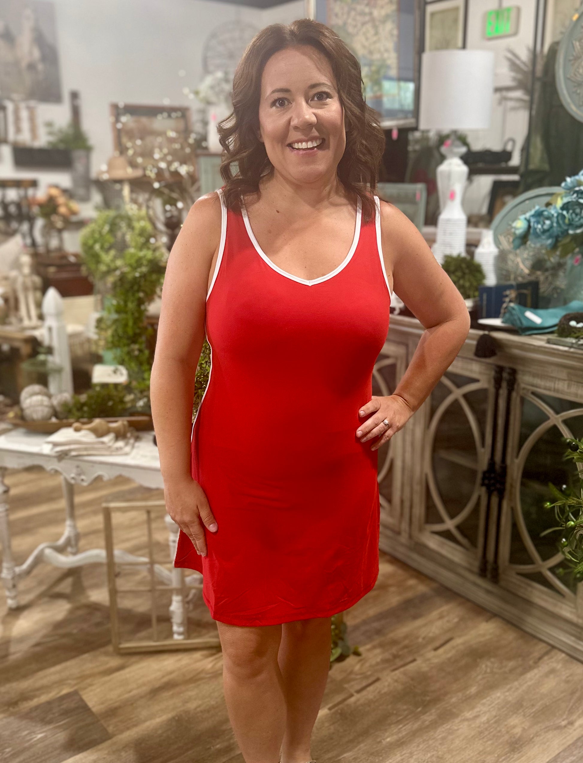Enjoy effortless comfort and style with the Recycled Butter Piping Shortsie. Crafted from soft butter fabric, this flowy skirt features built-in shorts for easy movement. Wide straps and crisp white piping add a playful touch, making it perfect for walking, sporting events, or any fun day out.