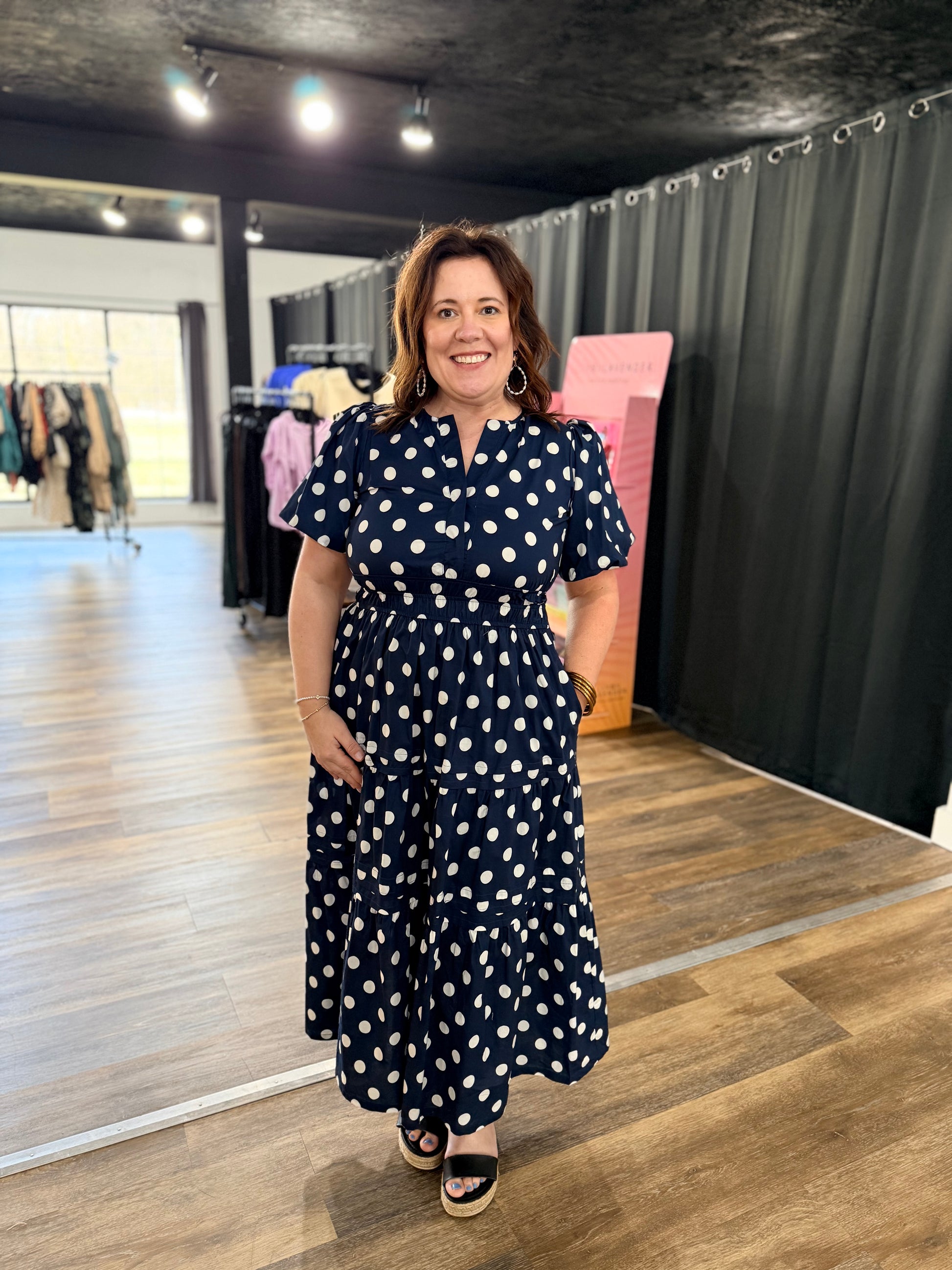 Twirl into the spotlight in this charming midi dress that's equal parts whimsy and wearability. Featuring delightful puff sleeves that frame the shoulders with effortless elegance, a fitted waist with gentle elastic for all-day comfort, and a cheerful polka dot print that dances across soft woven fabric. Practical pintucks add subtle texture and dimension, while hidden pockets keep your essentials close. Perfect for brunch dates, garden parties, or whenever you want to feel a little extra fabulous.