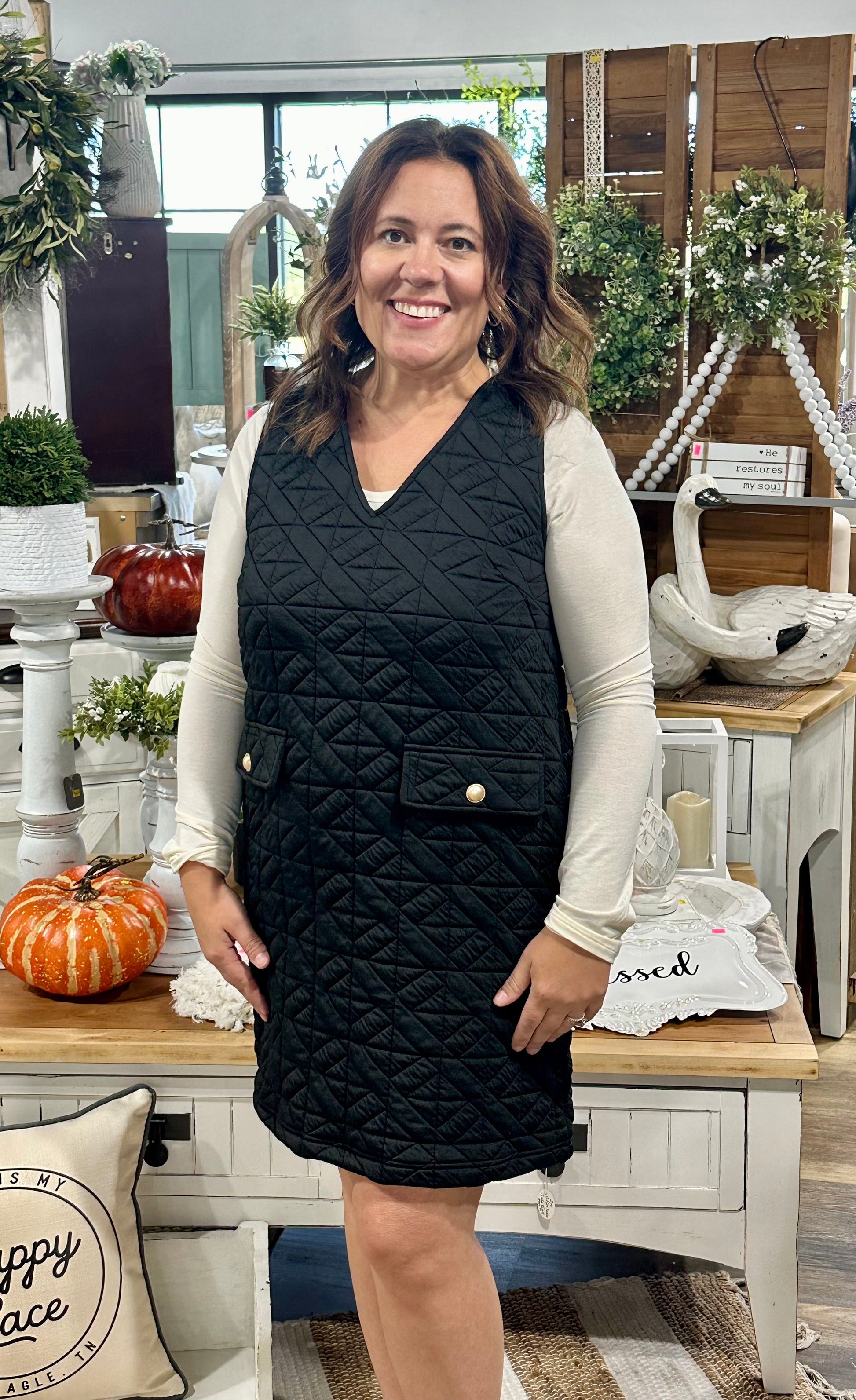 This playful sleeveless shift dress features a solid textured fabric that adds subtle charm to your look. Designed with convenient side pockets and a stylish front fake pocket, it blends practicality with fun flair. Perfect for effortless days when you want comfort and a touch of whimsy.