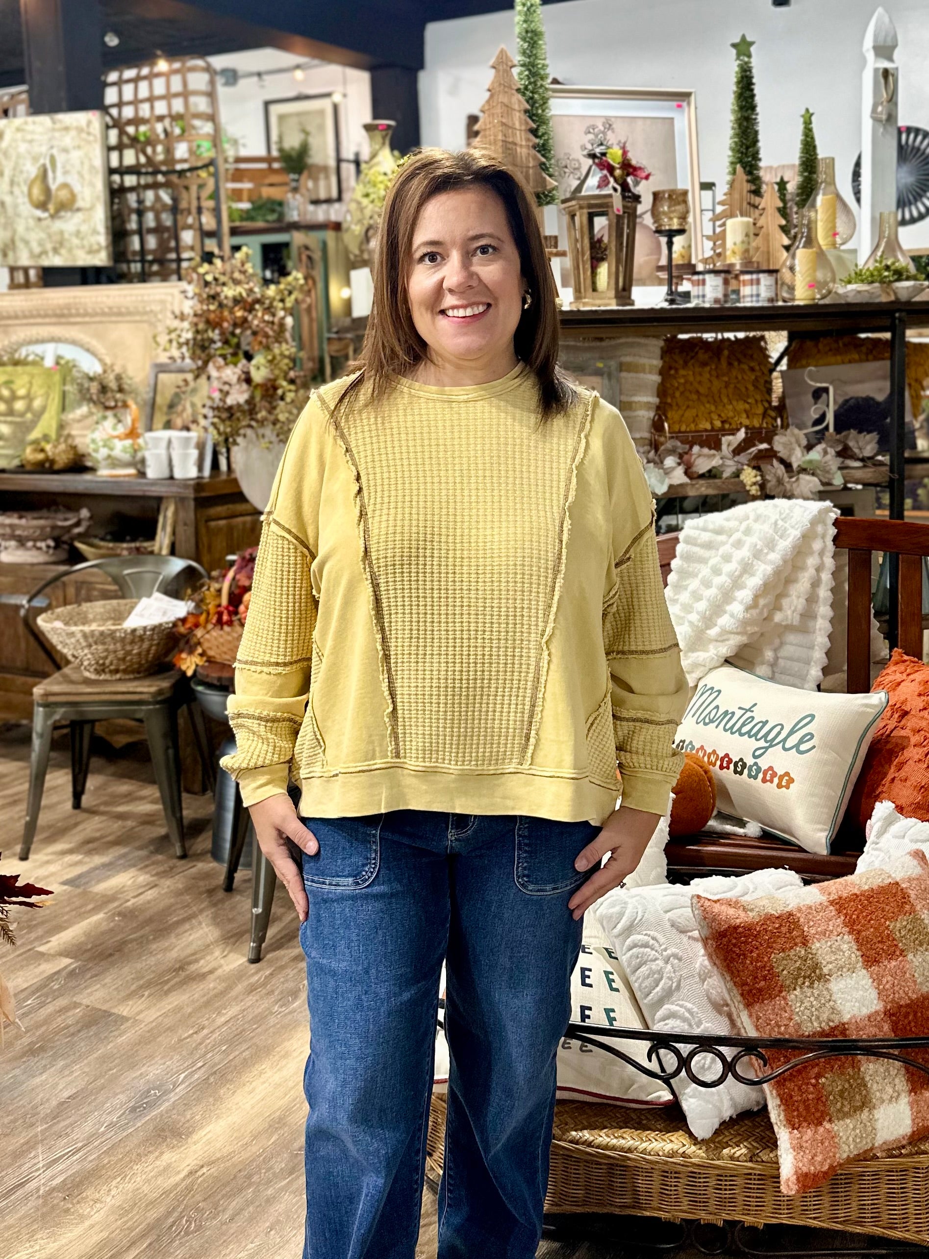 Embrace cozy cool with the Trimmed Out Top! This oversized crew neck features a textured fabric and edgy exposed seams for a laid-back vibe. Distressed details add just the right amount of attitude, making it your new go-to for effortless style and comfort. Perfect for days when you want to look relaxed but still stand out.