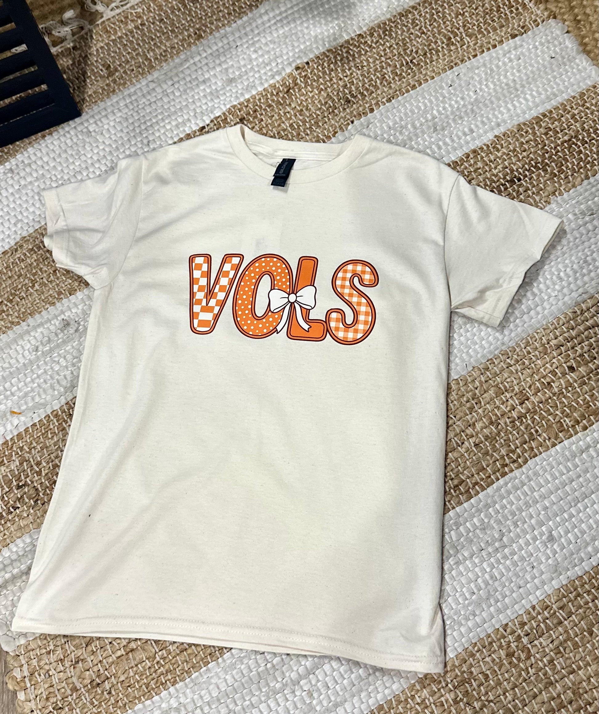 Get comfy and show some team spirit with the Vols Cream Bow Tee! Crafted from soft, durable Gildan Ultra Cotton® fabric, this unisex tee blends style and comfort effortlessly. Its creamy tone and playful bow design celebrate your Vols pride while keeping things casual and cool—perfect for game days or everyday fun!